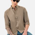 The classic button-down collar and neatly finished buttons add a timeless touch, while the full sleeves can be rolled up for a relaxed, laid-back style. The neutral beige colour makes this shirt extremely versatile, allowing it to be easily paired with jeans, chinos, or trousers for both casual and semi-formal looks.