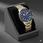Crafted with a premium two-tone stainless steel bracelet in gold and silver, this watch offers a refined finish that pairs effortlessly with both casual and formal outfits. Its strong case and rotating bezel provide a bold, masculine appeal, making it a true statement accessory.