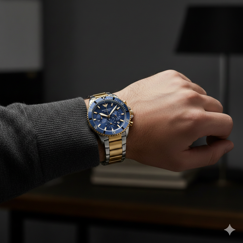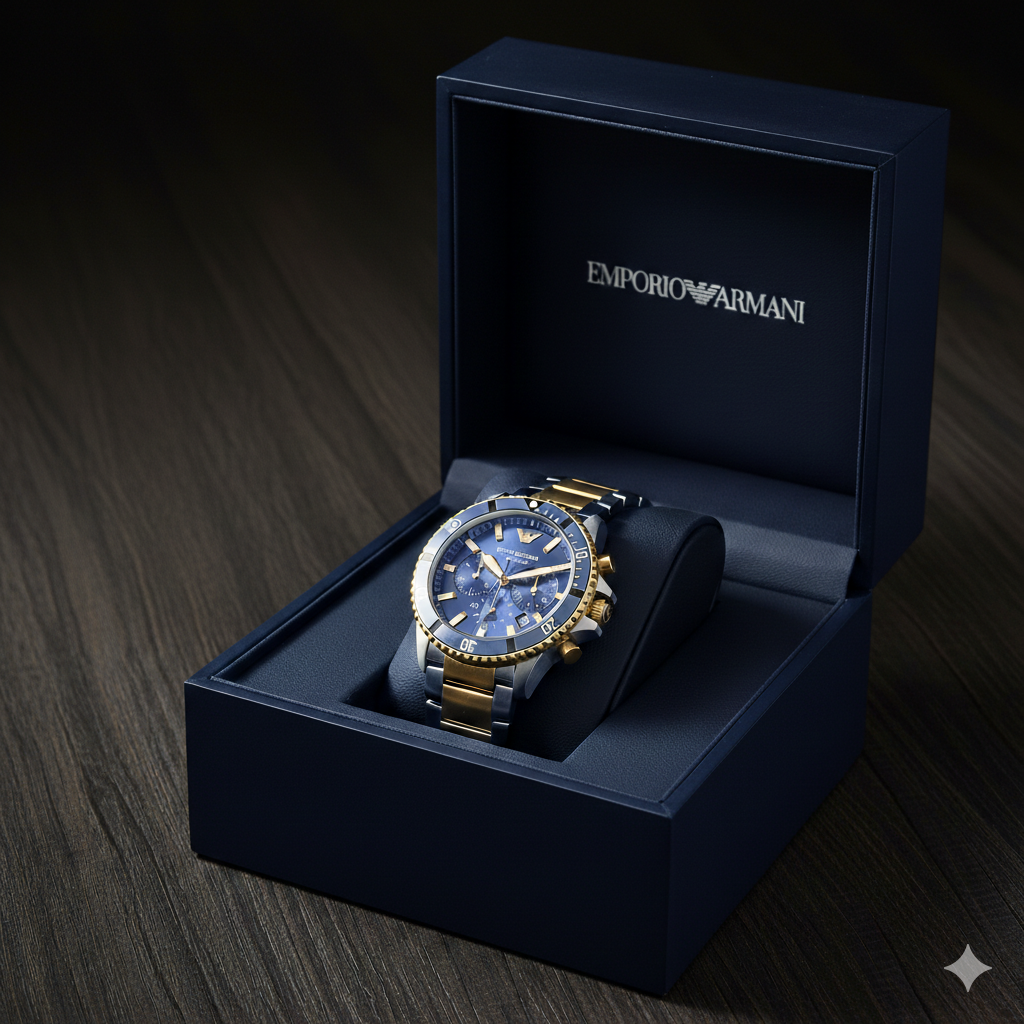 Emporio Armani Luxury Chronograph Watch – Blue Dial with Gold & Silver Strap