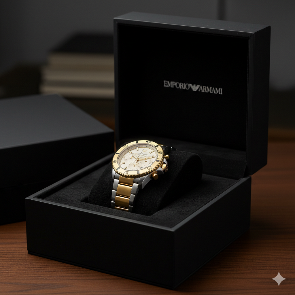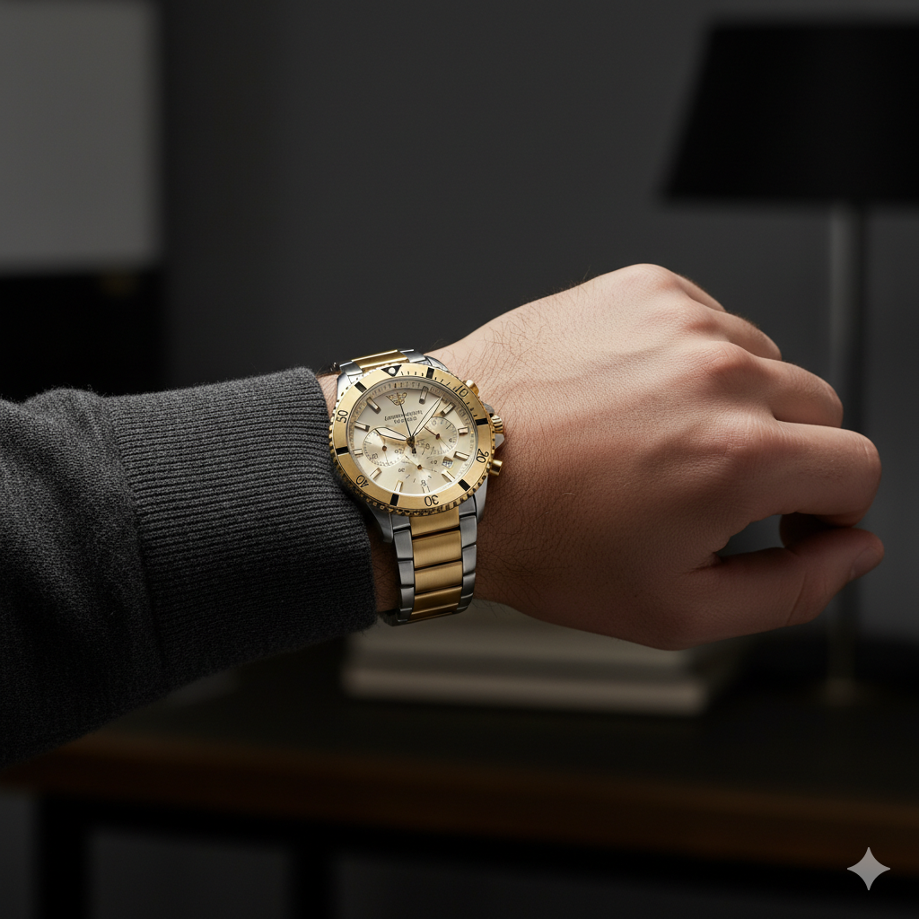 Emporio Armani Two-Tone Chronograph Watch – Gold & Silver Luxury Elegance