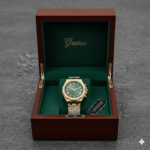 This GUESS premium luxury wristwatch is crafted for individuals who carry class, confidence, and modern style effortlessly. The rich green textured dial, paired with a gold-tone stainless steel case and bracelet, delivers a royal, high-end appearance that instantly elevates your look.