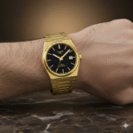 The watch features a striking black dial with a subtle textured pattern that adds depth and character. Sleek gold hour markers and slim hands provide excellent readability while maintaining a clean and minimalist aesthetic. The date window positioned neatly on the dial adds everyday practicality without disturbing the balanced design. A solid gold crown complements the case, ensuring smooth time adjustments and reliable functionality.