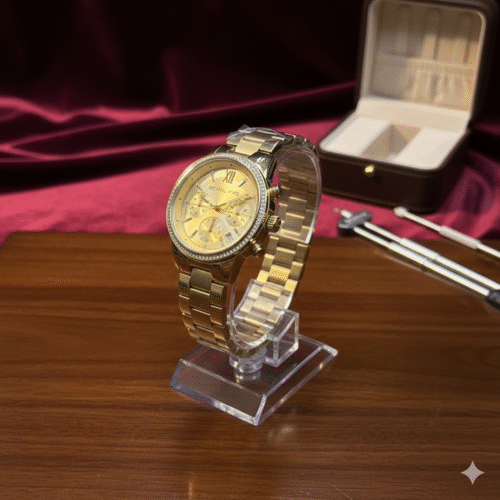 This elegant gold-tone wristwatch is a perfect blend of luxury, sophistication, and timeless design. Crafted with a beautifully polished gold-finish metal bracelet, the watch exudes a premium and refined appearance that instantly elevates any outfit. The bracelet features a sturdy yet stylish link design, ensuring both comfort and durability for everyday wear as well as special occasions.