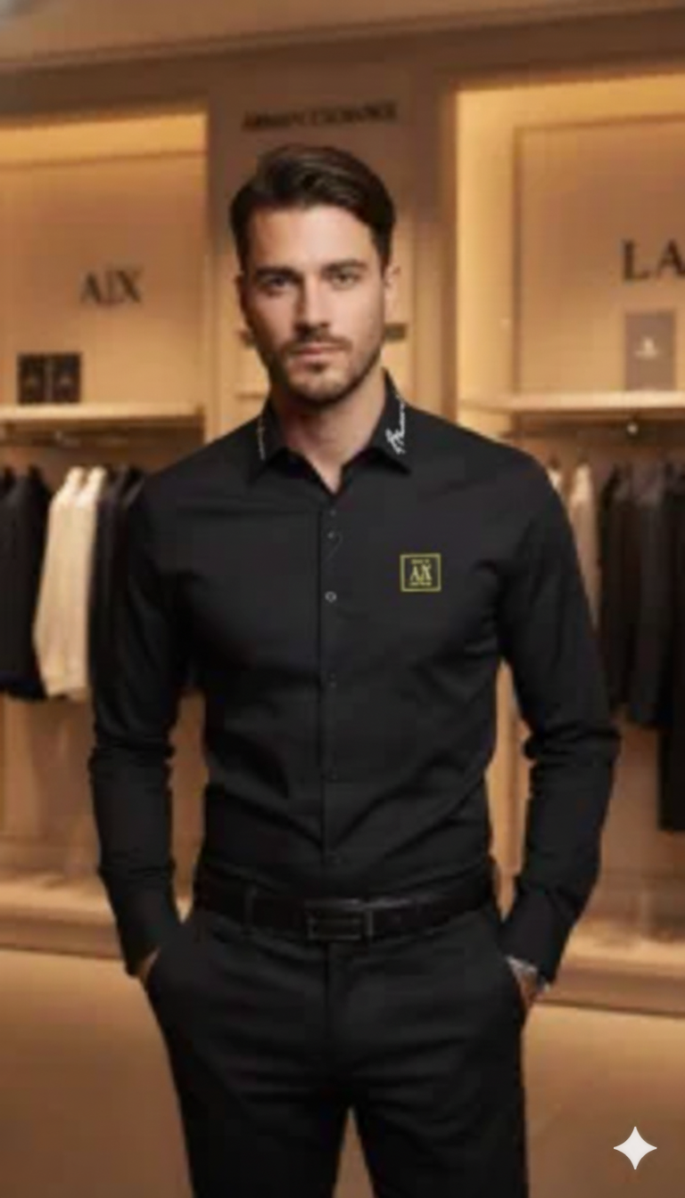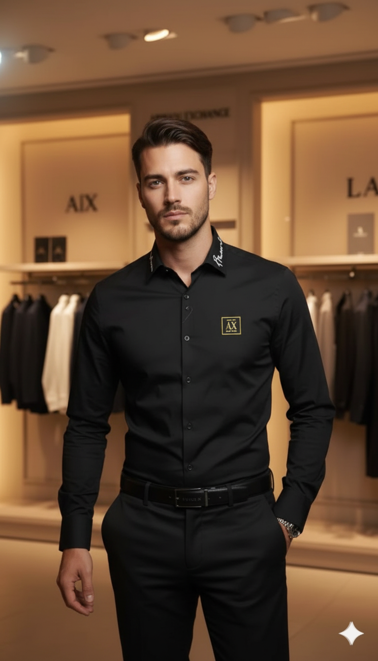 Featuring a classic button-down front, full sleeves, and a sharp collar, this shirt delivers a clean and polished appearance. The subtle A|X logo on the chest adds a touch of luxury branding without overpowering the design. Whether you’re heading to a business meeting, evening event, or a special occasion, this shirt ensures you stand out with effortless elegance.